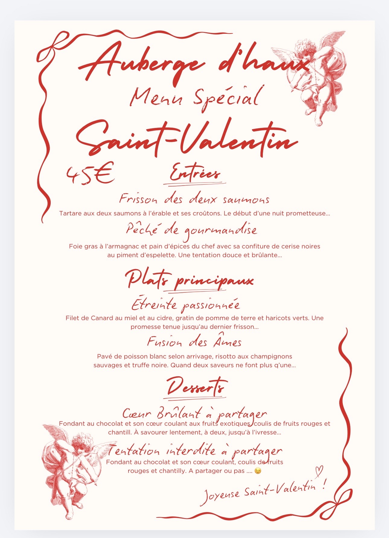 A l’approche de la Saint-Valentin, n’attendez plus pour réserver votre table avec votre bien-aimé pour un moment inoubliable à l’Auberge d’Haux.